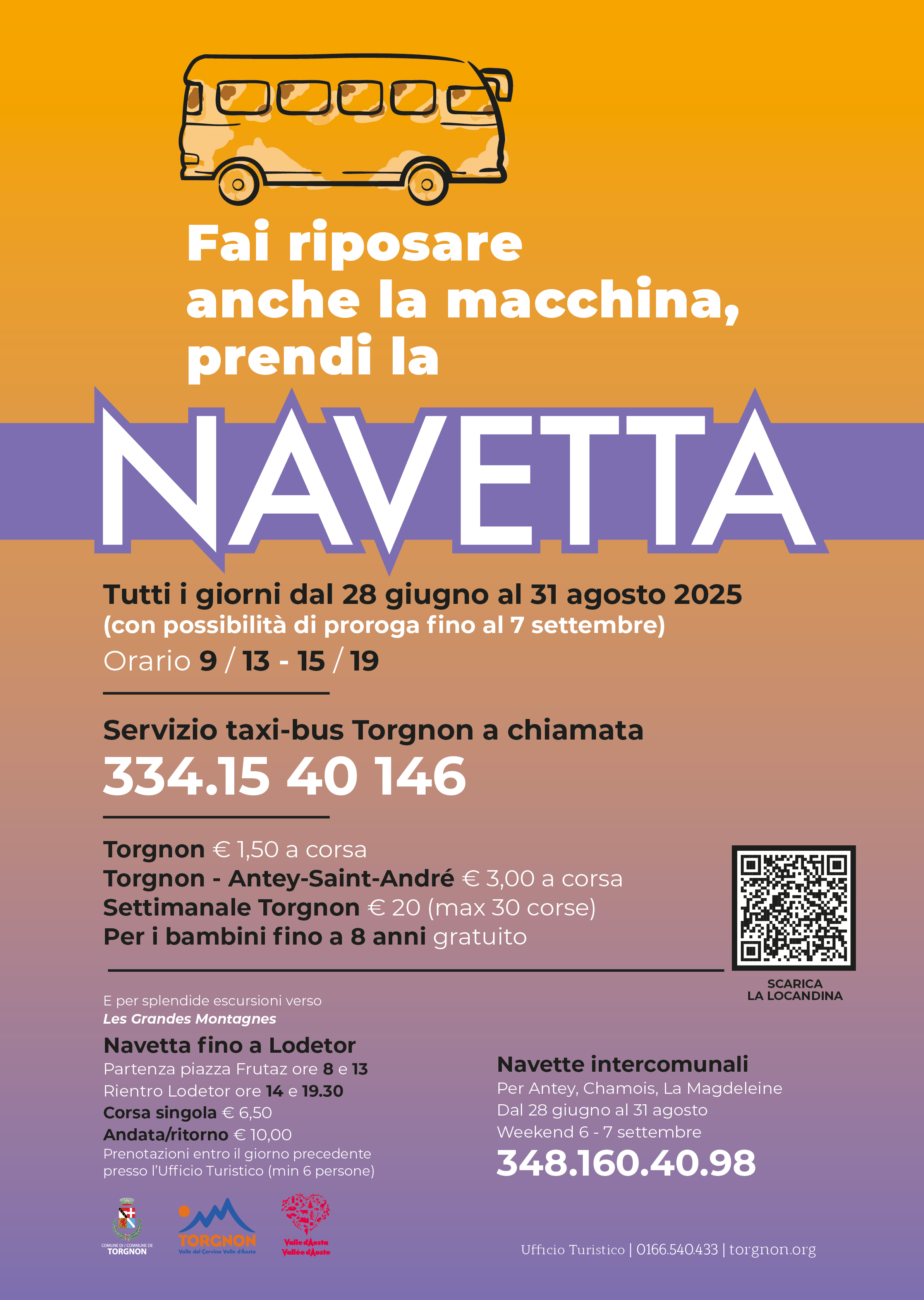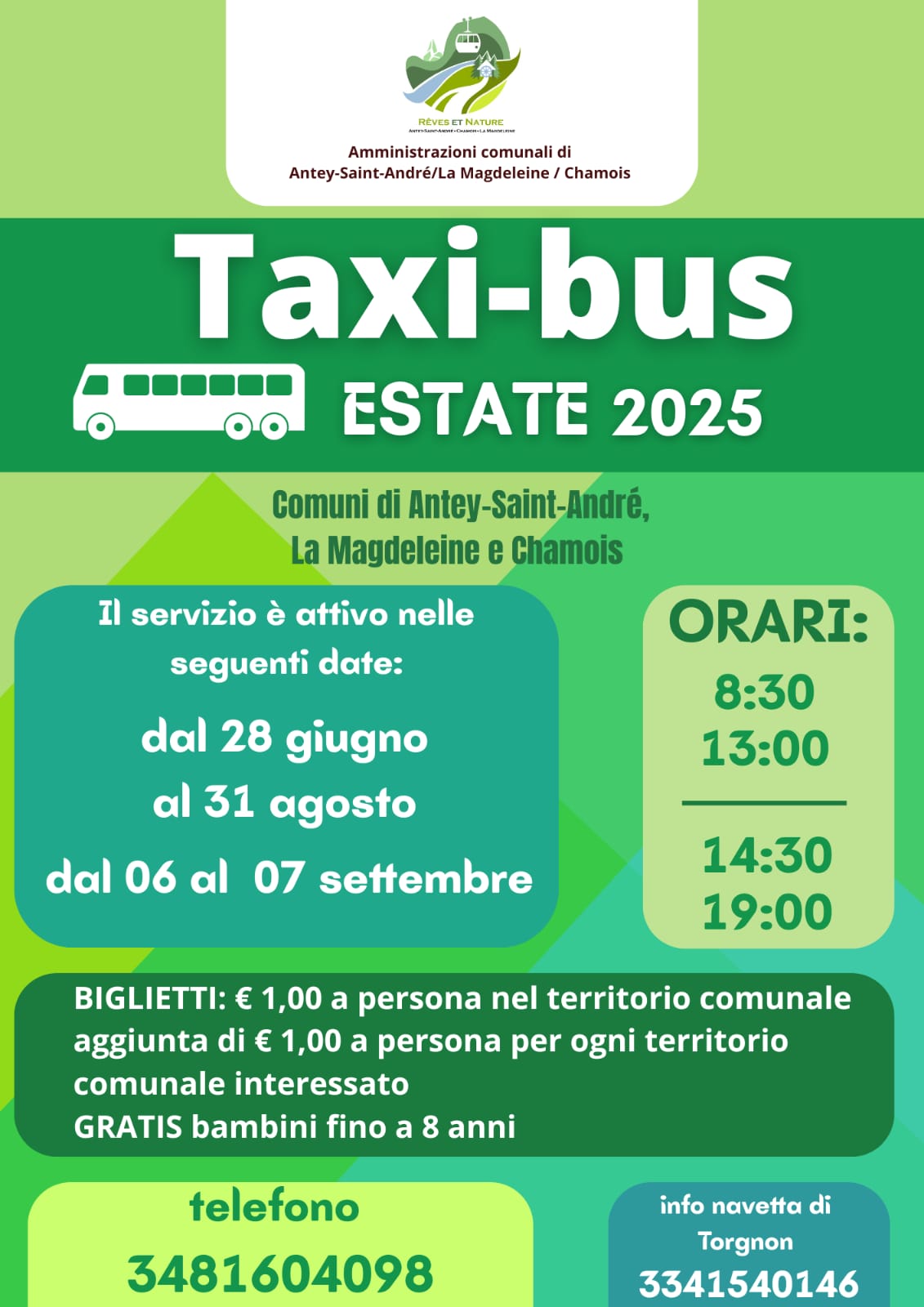 Per andare a Torgnon il servizio è prenotabile chiamando il numero 3341540146 con orario dalle ore 9.00 alle 13.00 e dalle 15.00 alle 19.00 ed è attivo nei seguenti periodi: